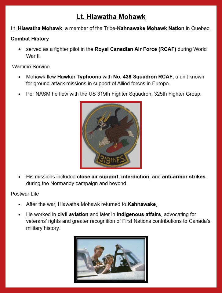 The first is to recognize the World War II Native North Americans who flew combat then. Unfortunately, the persons who recorded information for all who fought in that war were not careful about race or tribe. Fortunately, Mr. CoPilot and our own aviation temple, NASM, identified two noteworthy aviators indigenous to our continent: