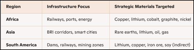 China has masterfully positioned its international policies. The PRC exerts substantial influence across Africa, Asia, and South America through massive infrastructure investments and aggressive acquisition of strategic natural resources—especially minerals critical to clean energy and high-tech manufacturing. This AI created chart summarizes Beijing’s strengths in these regions, all of which portend to be markets of major growth.
