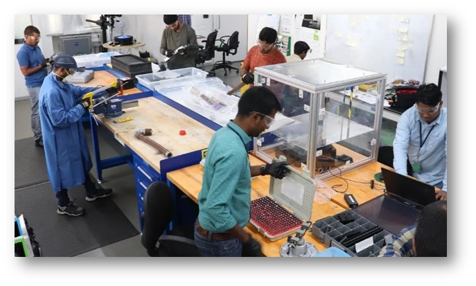 Above, Boeing Technology Innovation teammates examine components in a teardown lab in Bangalore, India. (Photo © Boeing)