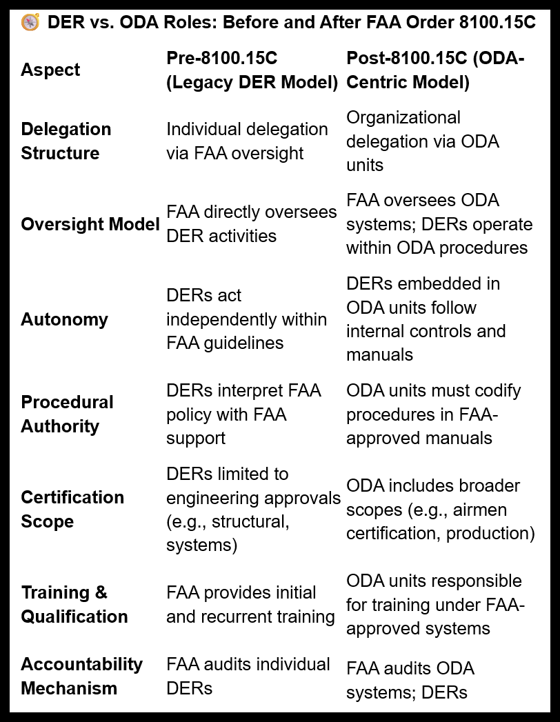 There’s still delegation, but they delegate to a structure rather than a person. In the FAA’s words, “Managing organizations is more efficient than managing the activity of many individual designees.” In practice, that means fewer independent DERs and a gradual transfer of authority to corporate systems.