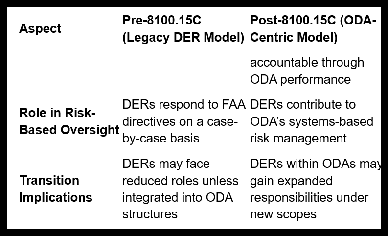 This backdoor integration of DERs to ODA organizations, so the FAA believes, will increase the direct management of airworthiness decisions and add more structured compliance roles on the here-to-for independent DERs.