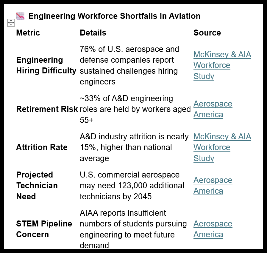 Aside from the negative consequences to the current DER fraternity, this ORDER may INVOLVE SIGNIFICANT HUMAN RESOURCE TALENT RISK[2]. As the FAA is well aware[3] (particularly AVS), the aviation and aerospace sectors are facing a critical shortage of engineering talent, with STEM recruitment lagging behind government and industry demand. An ODA centric system may have problems attracting and replacing the needed talent to perform these airworthiness judgments, as this table demonstrates: