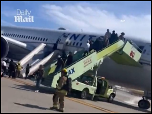 The United Airlines flight was forced to make an emergency landing after smoke began filling the cabin. A firefighter is pictured on the tarmac as passengers evacuate the plane