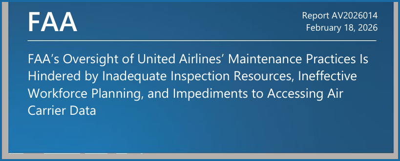 The Dean of Aviation Safety Journalism, Sean Broderick, has synthesized the DOT IG’s 34 page FAA’s Oversight of United Airlines’ Maintenance Practices Is Hindered by Inadequate Inspection Resources, Ineffective Workforce Planning, and Impediments to Accessing Air Carrier Data. Aviation Week Network’s Senior Air Transport & Safety Editor highlighted the following key quote form the February 18, 2026, report: