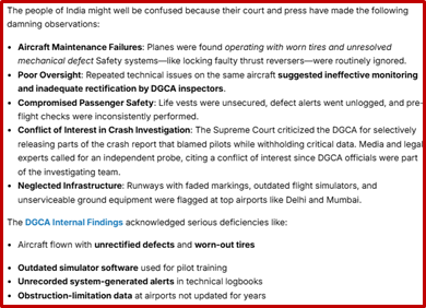 - A very telling moment—the first press conference was not conducted by extremely well qualified Director of the AAIB, Group Captain G.V.G. Yugandhar. Instead, the initial briefing was led by the Civil aviation secretary Samir Kumar Sinha, a career Administrative Service Officer with no real aviation experience.