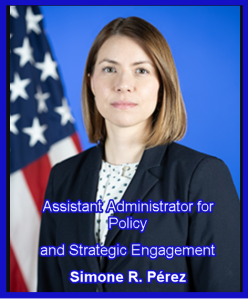 The new Assistant Administrator for Policy and Strategic Engagement (APL)is SIMONE R. PÉREZ. Her relevant credentials are strong evidence that her appointment shows that the Administration is committing to this important, though neglected, mission: