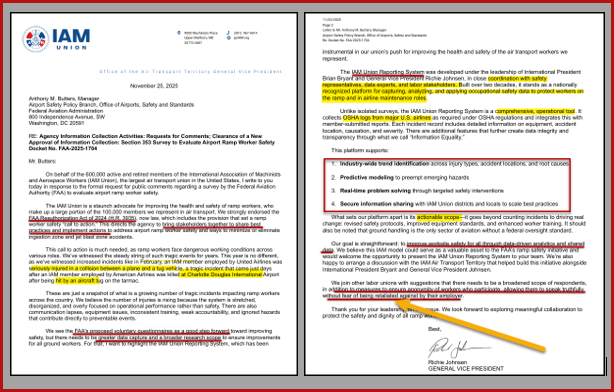 WASHINGTON, Dec. 3, 2025– The IAM UNION (International Association of Machinists and Aerospace Workers), the largest air transport union in North America, recently wrote a letter urging the Federal Aviation Administration (FAA) to strengthen its plans to improve airport ramp worker safety significantly.