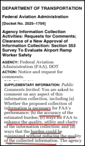 The FAA survey stems from a provision in the FAA Reauthorization Act of 2024, which directs the agency to initiate a RAMP WORKER SAFETY “CALL TO ACTION.” The effort aims to bring together stakeholders, share best practices, and implement measures to reduce hazards,