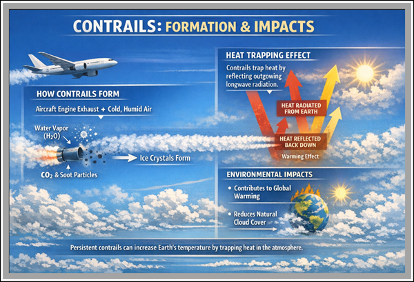 - Mechanism: Contrails form when water vapor and particulates (soot, aerosols) from engines encounter cold, humid air at cruise altitudes, forming ice‑cirrus clouds.