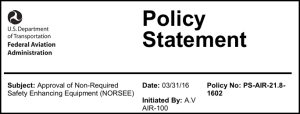 One avenue which may be most relevant to new aircraft safety systems is the Non-required Safety Enhancing (NORSEE). This policy was issued to promote innovation by providing a streamlined approval process for equipment that measurably increases aircraft safety. NORSEE applies to aircraft under