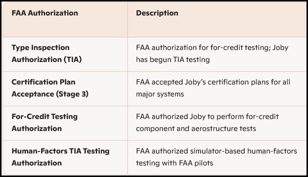 - September 2025, Joby Aviation joined a newly announced program led by the FAA designed to accelerate the deployment of eVTOL aircraft and air taxi services. The so-called eVTOL Integration Pilot Program (eIPP),