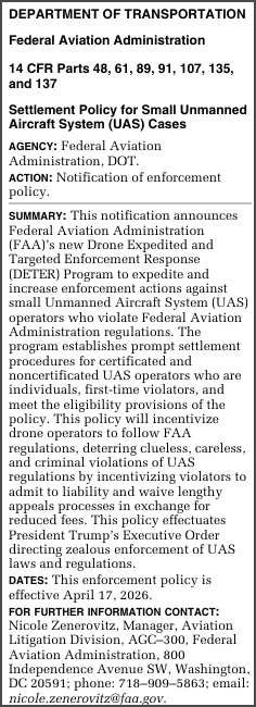 The FAA has issued a new policy called Drone Expedited and Targeted Enforcement Response (DETER[1]) program. Historically, in an effort to ease into the nascent UNMANNED (no longer “unpersonned”) AERIAL VEHICLE SYSTEMs(UAS) flying by hobbyists and businesses, the FAA employed a policy labeled “education-first.” With UAS operations estimated millions of small UAS, the regulators decided to shift to mandatory legal enforcement for a wide range of infractions. This shift is driven by the Restoring American Airspace Sovereignty Executive Order (June 6, 2025), which requires “zealous enforcement” of UAS laws and other legal bases[2].