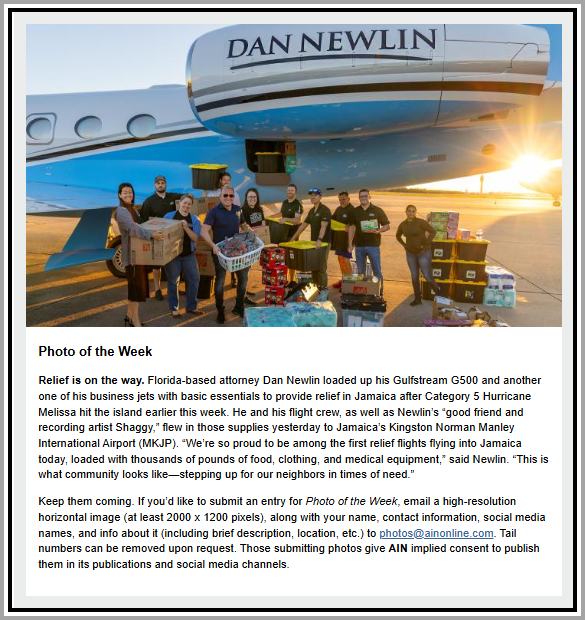 Hurricane Melissa’s Level 5 winds, water surge and horrendous damage to Jamaica’s infrastructure wreaked havoc, the historic natural disaster in the history of this Caribbean nation. AIN published an article, below, about NBAA’s HERO, OPERATION AIR DROP, AEROBRIDGE, AIRLINK, and other organizations TREMENDOUS HUMANITARIAN AID.