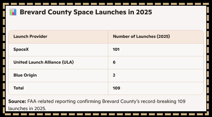 - Brevard County experienced a record-breaking 109 space launches in 2025, leading TRANSPORTATION OFFICIALS TO EVALUATE HOW THE INCREASED MISSION FREQUENCY AFFECTS COMMERCIAL AVIATION SAFETY.