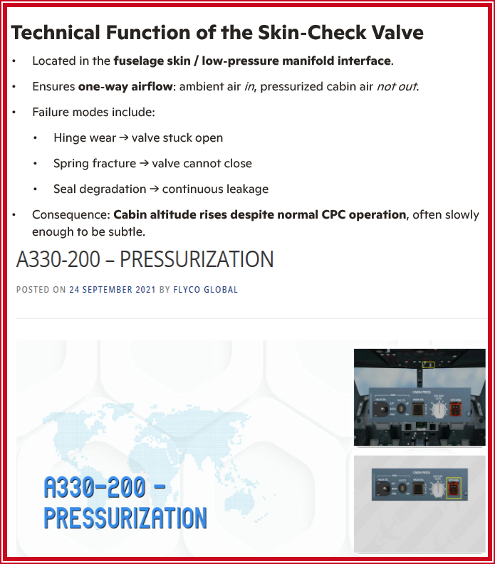 A safety consequences of failed skin‑check valve ,at cruise altitude on an A330, are very real because the valve sits in a part of the pressurization system that normally goes unnoticed—until it doesn’t. The skin‑check valve is a one‑way valve that prevents pressurized cabin air from leaking into the fuselage skin cavity and low‑pressure manifold. At cruise: