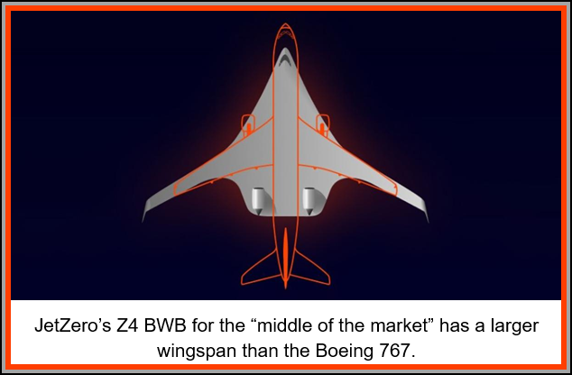 The design is a 250-passenger airliner, the same size as the larger “new midsize airplane” (NMA) concepts that Boeing explored but did not bring to fruition. JetZero says the BWB will be 30% more aerodynamically efficient than the aircraft it replaces. The company compares the economics of its Z4 aircraft with the Boeing 767-200ER. It has not compared the Z4 with the current-generation aircraft that the BWB would actually compete against for sales and costs.