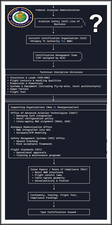 In that there is no history of the agency’ issuance of a TC for a BWB, the enterprise submitting its application FIRST will be THE TEST CASE for what criteria, tests and data will be required for a positive determination of airworthiness. As the above sketch of the process, the TC maze among AIR, ACO and OAAT will likely see switches among the applicant’s team and the three organizations now to be involved.