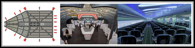 - Wing + fuselage merged into a single lifting body