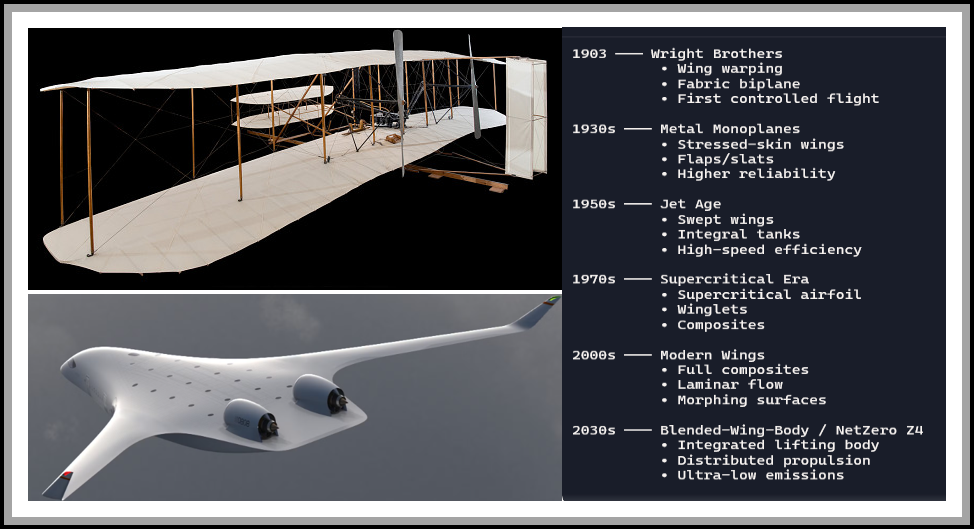 As the introductory image conveys, aeronautics between 1903 and 2030 (projected) has gone from WING WARPING to the B-W-B PLANE with revolutionary additions-